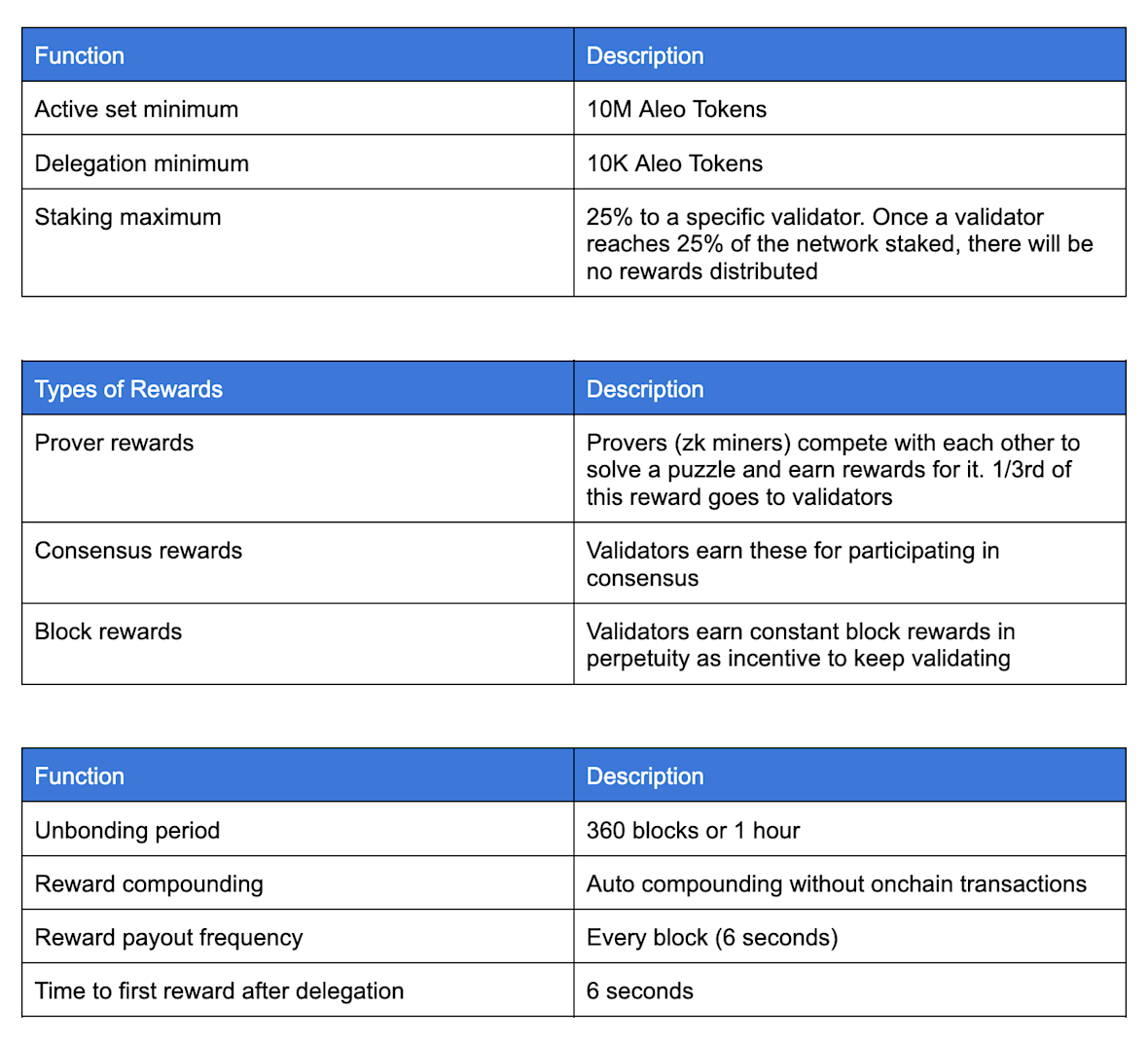 Stakers lock up (delegate) Aleo Tokens to help validators participate in consensus and secure the network. Rewards are earned and distributed with respect to the proportion delegated. In addition, validator nodes include proofs from prover nodes when creating blocks.