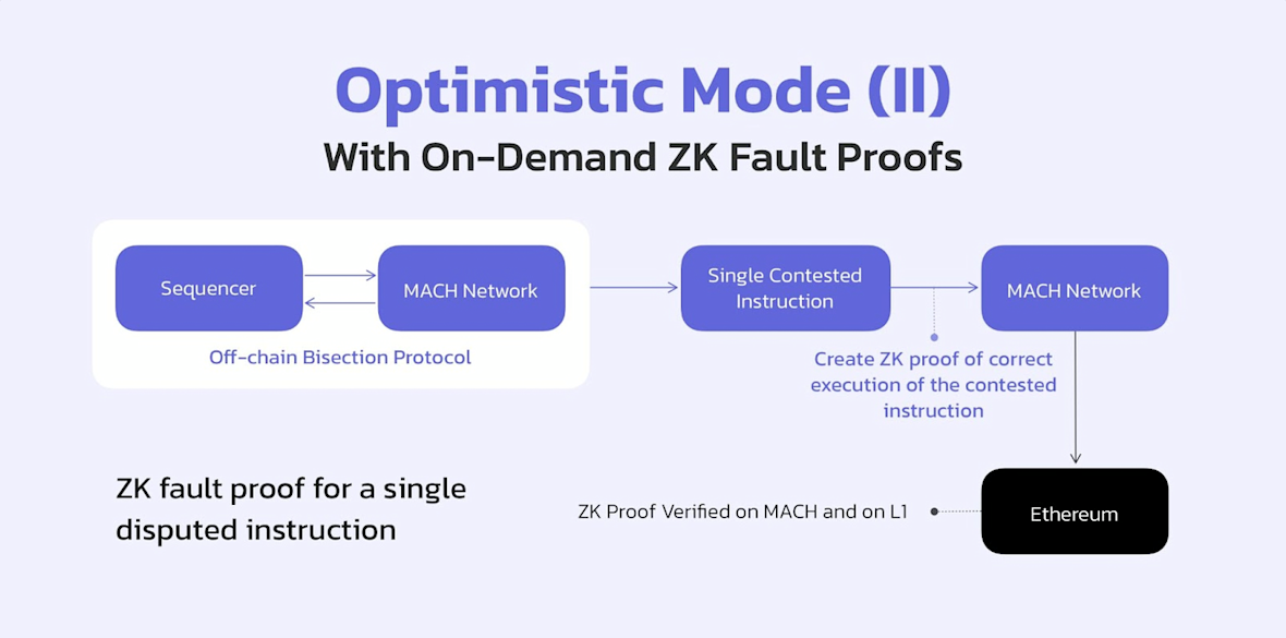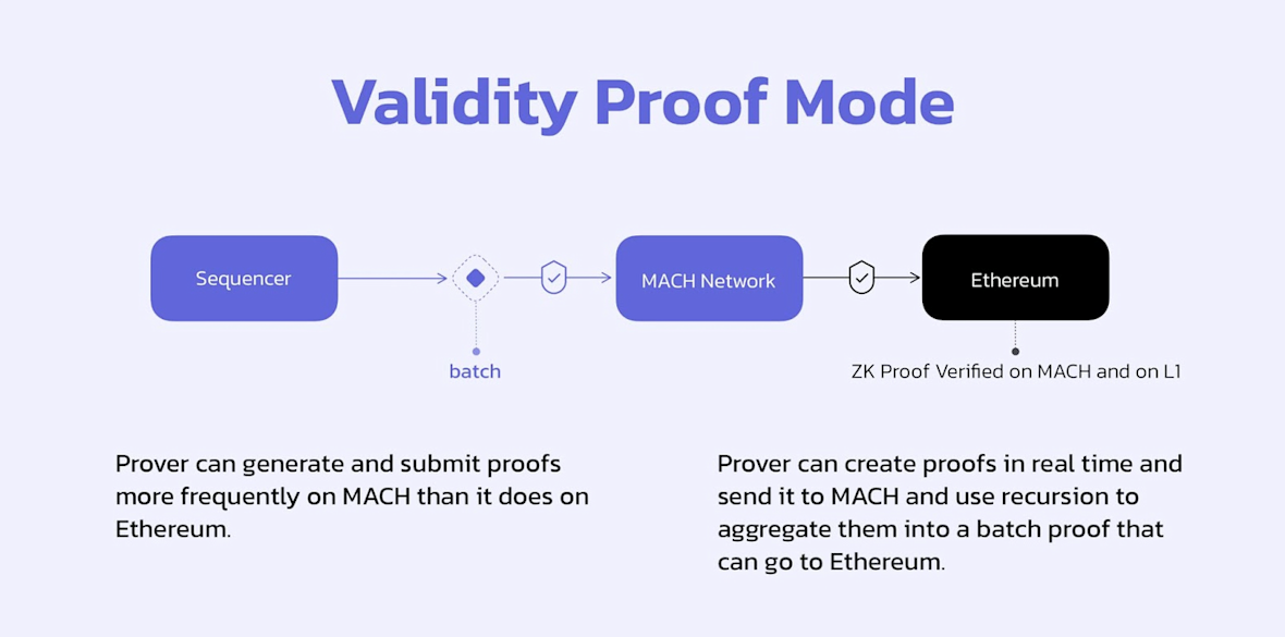 The MACH network acts as a decentralized verifier network for validity proofs. The validity proof will be generated along with the set of transactions and resulting state. MACH will reach consensus on the validity of the proof.