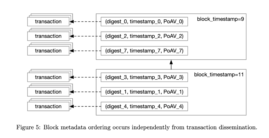 The protocol operates in a pipeline of rounds. In each round, a leader proposes a new block based on the lead validator’s reputation, calculated by performance and stake. The selected leader then sends a proposal that contains the collected votes of the previous proposal, the leader’s proposed order of the transactions for the new block, and a proposal timestamp. Non-lead validators then vote on the leader’s proposal. Once quorum is reached, rewards are given proportionally to stake and performance as a leader.
