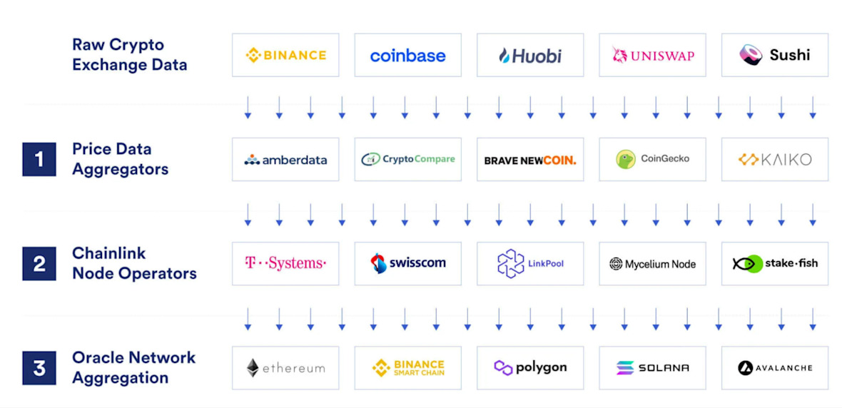 Oracle network aggregation: On-chain, a smart contract verifies and aggregates answers from each oracle (updated by node operators) to form the latest trusted answer, which can then be queried by other contracts, such as DeFi protocols.