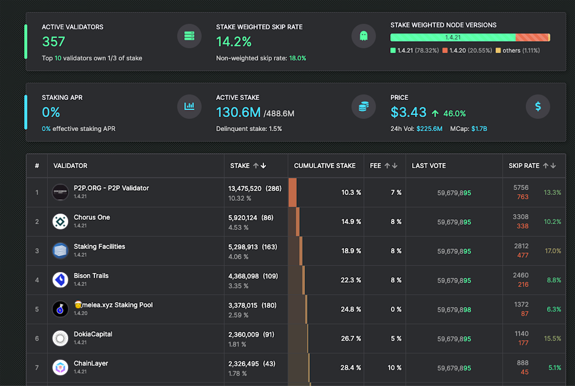 Active stake by validator on the Solana mainnet beta: Source